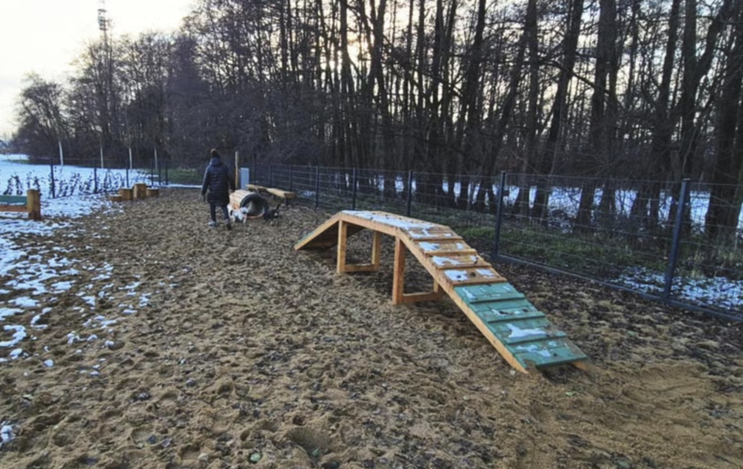 Sam wybieg dla psów został ogrodzony, dzięki czemu zwierzęta mogą biegać po nim bez ograniczeń. W środku umieszczono urządzenia tworzące tor przeszkód, m.in. płotki, trap, pniaki oraz tunel. Na odwiedzających park opiekunów czekają natomiast wygodne ławeczki, które umożliwiają obserwowanie czworonogów podczas zabawy.