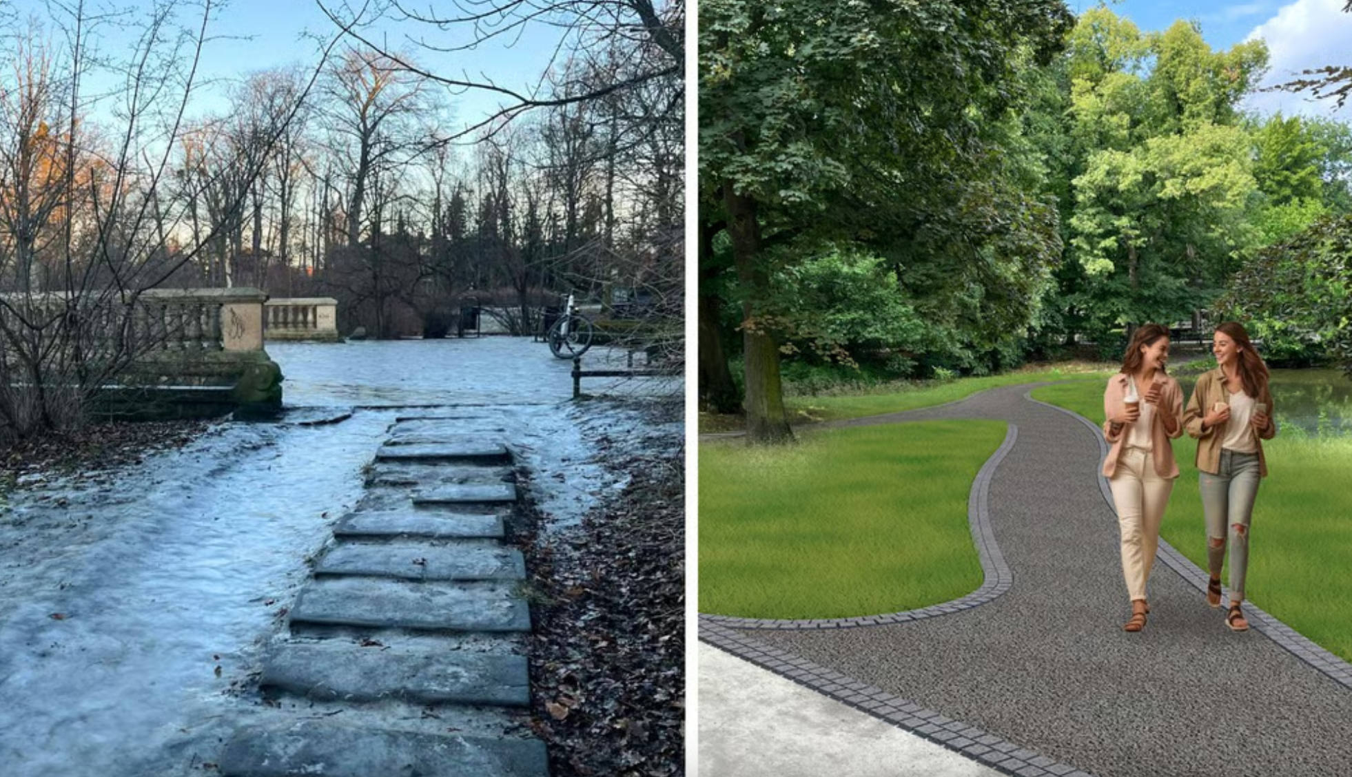 Zastosowany zostanie materiał przepuszczalny, układany na nasypach, co ma ograniczyć okresowe podtapianie ścieżek. Dodatkowo zaplanowano uzupełnienie linii brzegowej zbiornika wodnego, co wpłynie na lepszą ochronę zieleni w tej części parku.